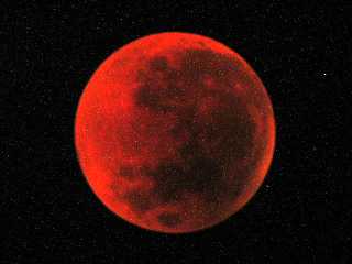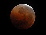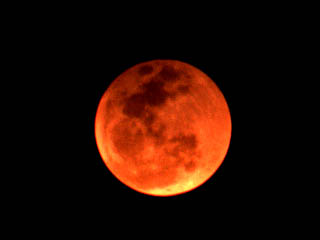 地球の影にスッポリ と入った暗いオレンジ色の月が夜空に浮かんでいます。