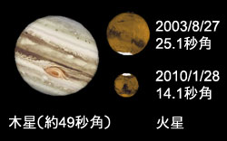 火星が大接近した2003年には、視直径は約25秒にまでなりましたが、2010年1月は最大でも14.1秒です。太陽系最大の惑星である木星の視直径(50秒弱)と比べたら、はるかに小さいものであることが分かるでしょう。