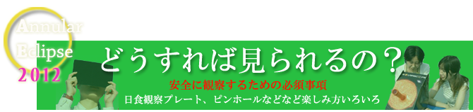 「2012年金環日食 日本日食委員会」は、国内天文関係の合同組織「日本天文協議会」のワーキンググループの一つとして2011年4月に発足し、安全な日食観察に関する周知などの活動を行っています。ウェブサイトでは、安全な観察に関する資料や、周知活動についてのニュースなどが掲載されています。