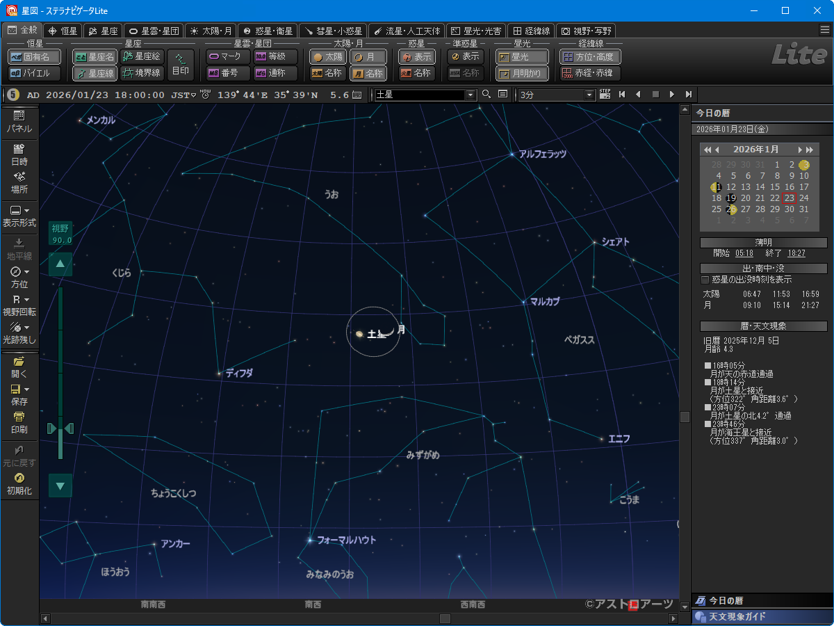 1月23日の夕方~宵、月と土星が接近して見える(» 解説)。画像クリックで表示拡大(ステラナビゲータLiteで星図作成)。