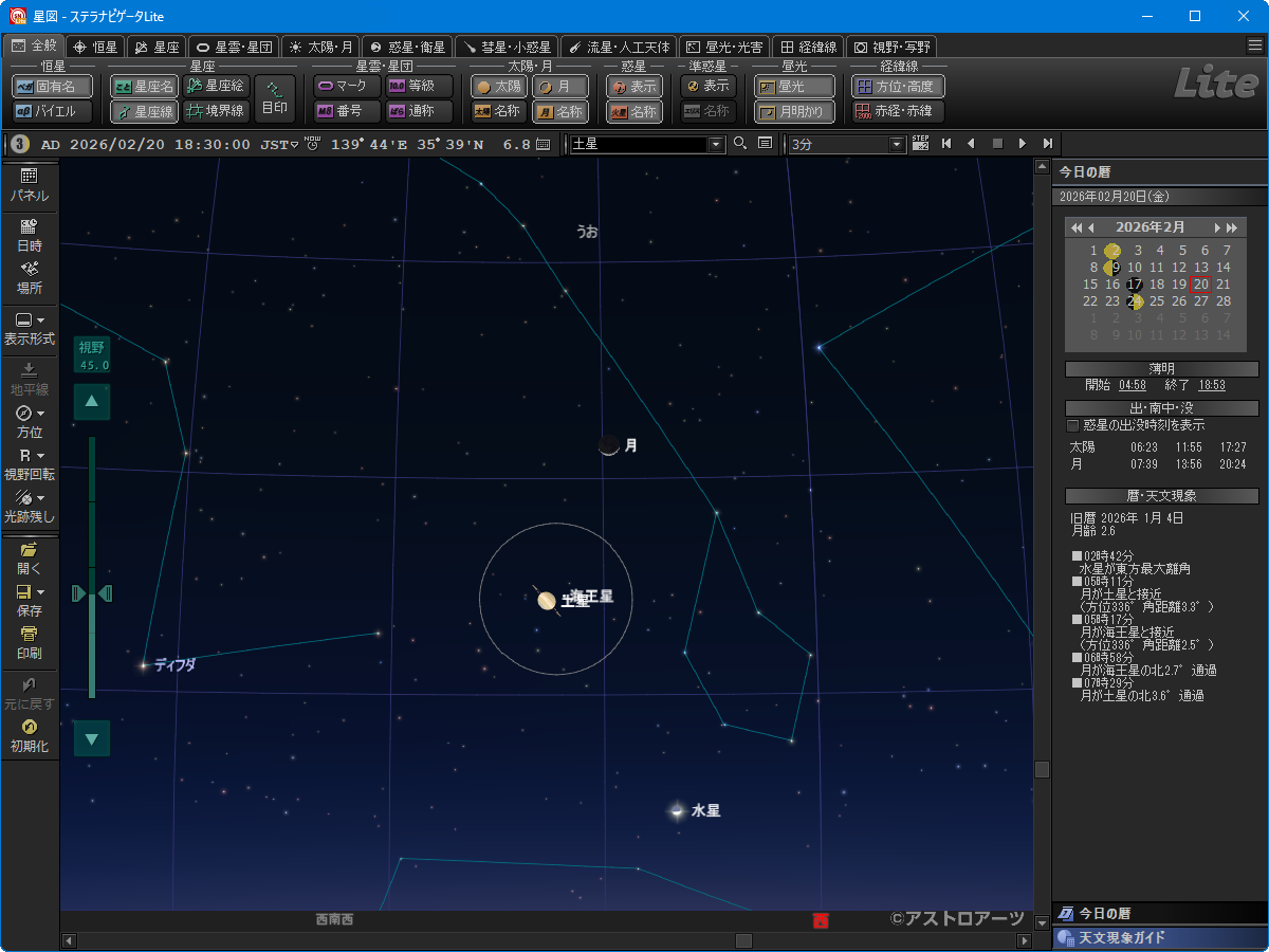 海王星と大接近 | 夕方~宵/最接近2月20日ごろ/期間内は離角2度以内(1月中旬以前も離角5度以内) |