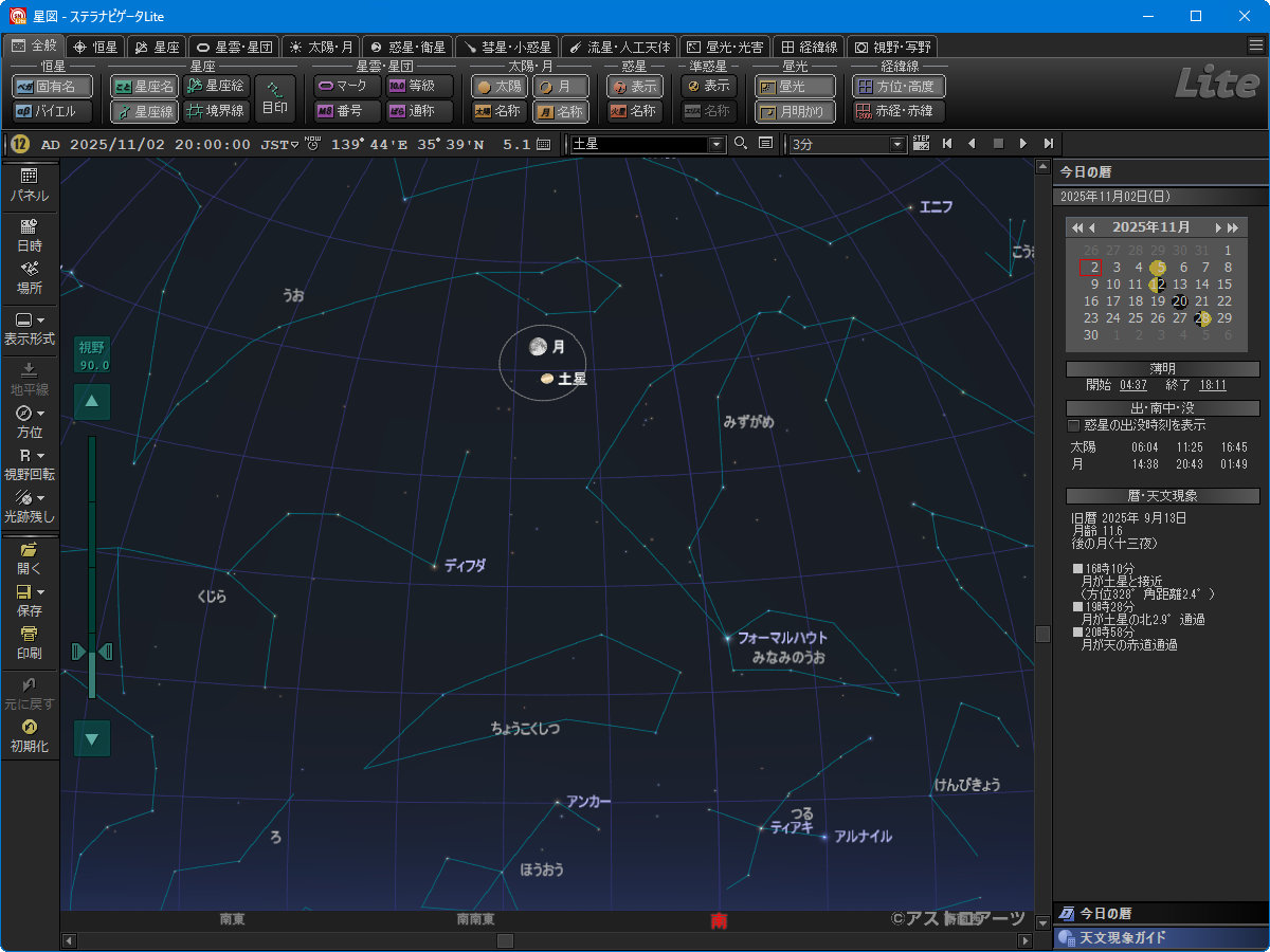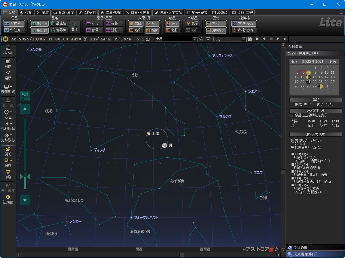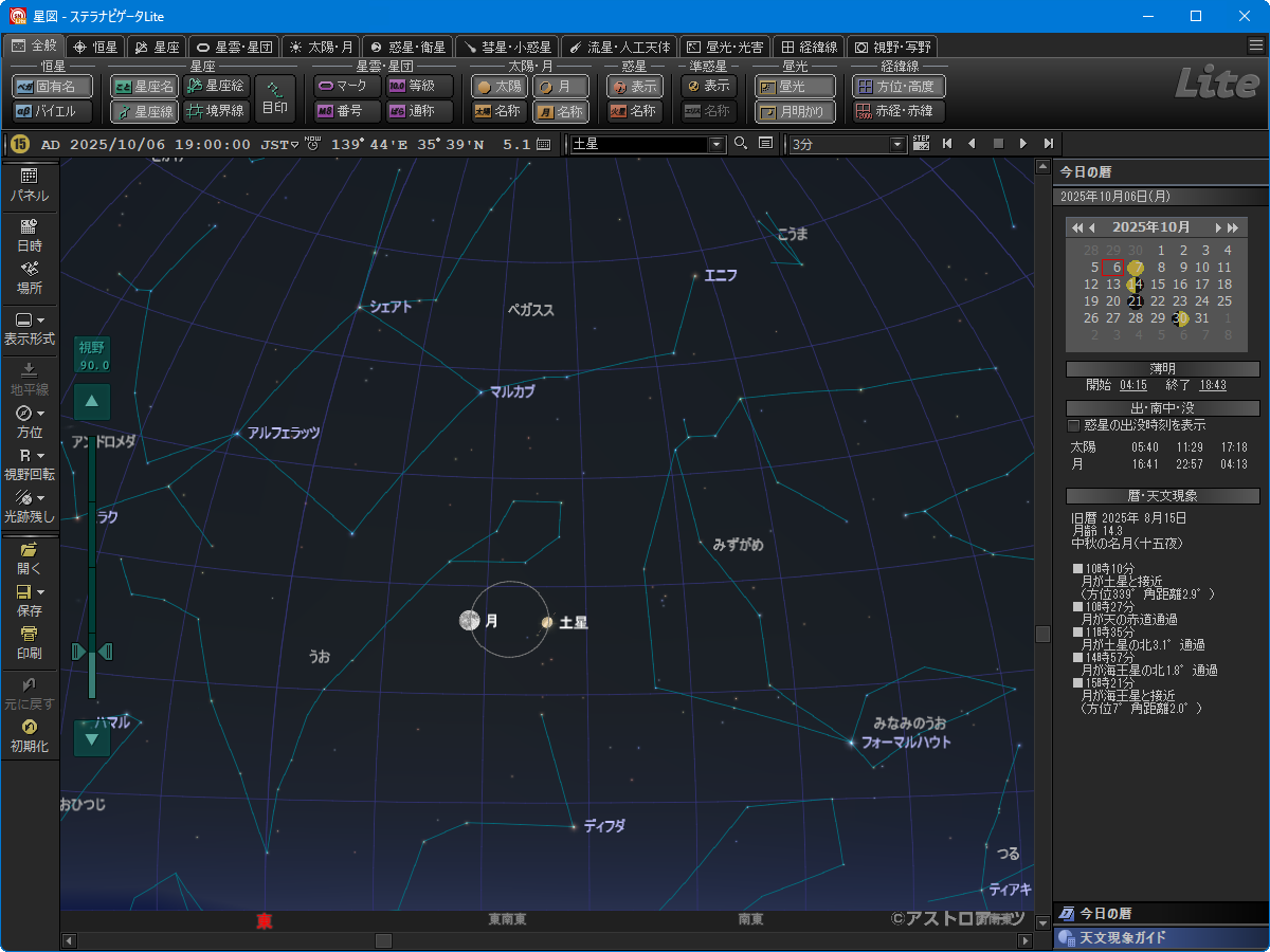 10月6日の夕方~宵、月齢15の月(中秋の名月)と土星が並んで見える。画像クリックで表示拡大(ステラナビゲータLiteで星図作成)。