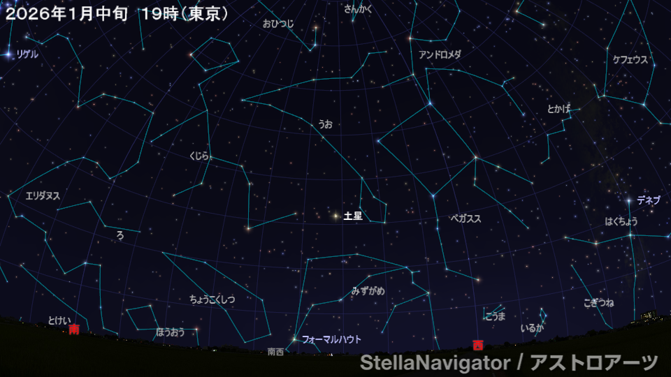 2026年1月中旬 19時の空(東京)。画像クリックで表示拡大(ステラナビゲータで星図作成)。