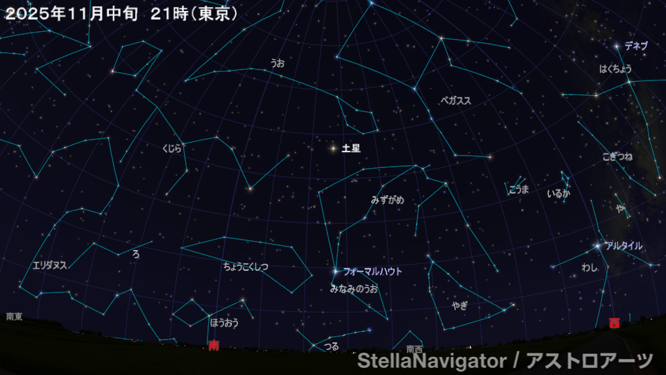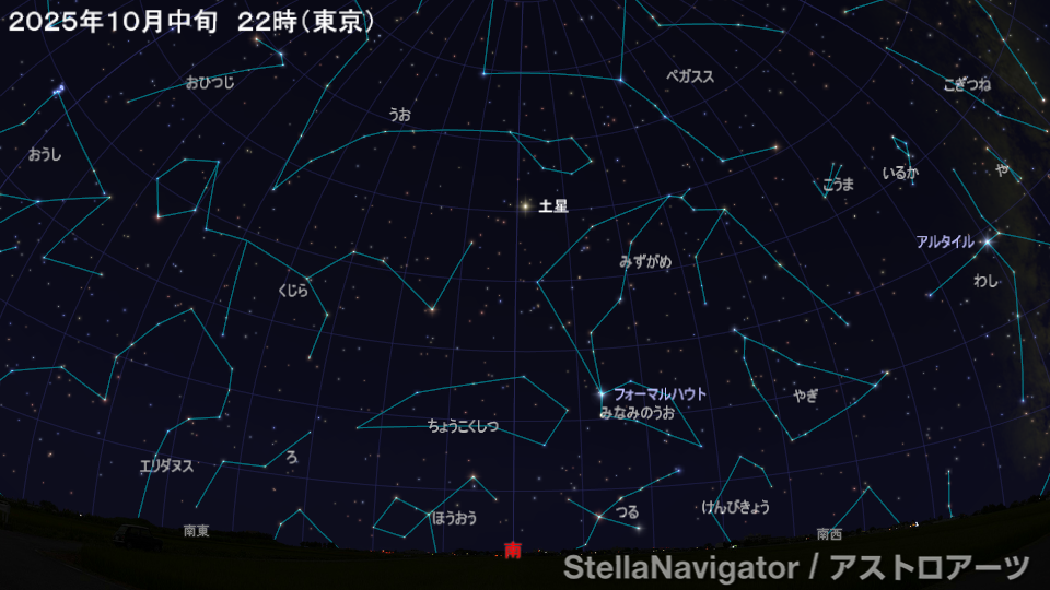 2025年10月中旬 22時の空(東京)。画像クリックで表示拡大(ステラナビゲータで星図作成)。