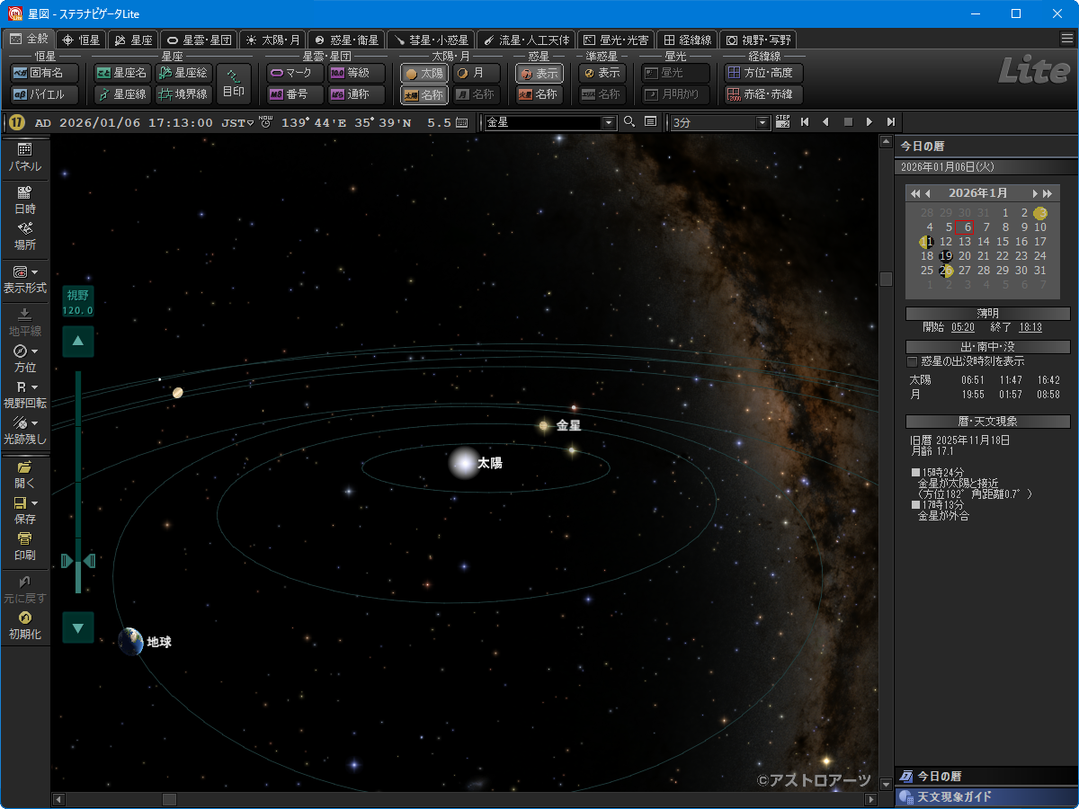 1月 6日 | 外合 | 太陽と同じ方向(太陽の向こう側)になる(見えない) 日付は赤道座標系(黄道座標系では7日) |