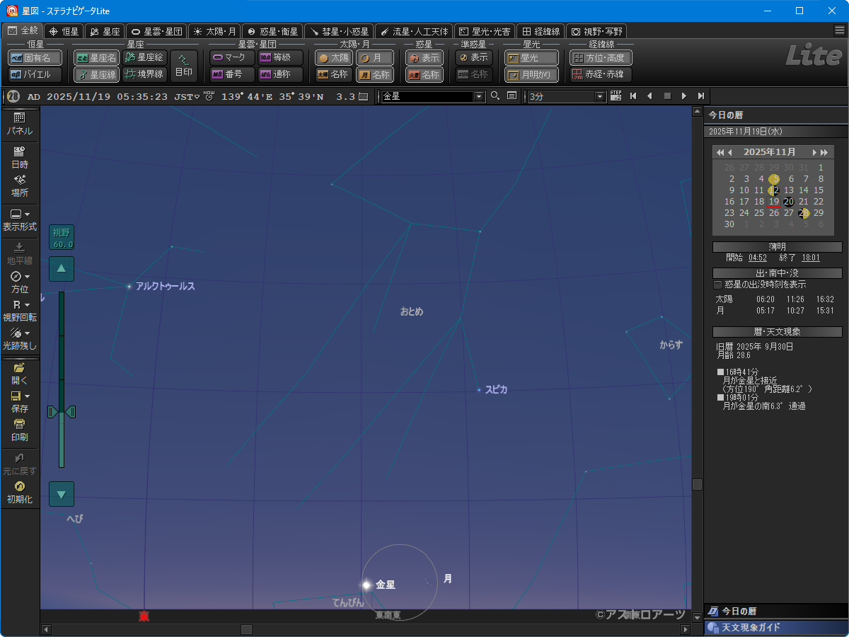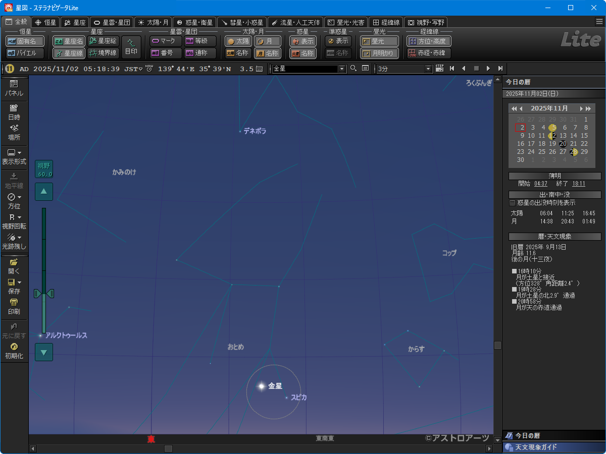 10月下旬から11月上旬の明け方、金星とおとめ座の1等星スピカが接近して見える。最接近は11月2日ごろ。画像クリックで表示拡大(ステラナビゲータLiteで星図作成)。