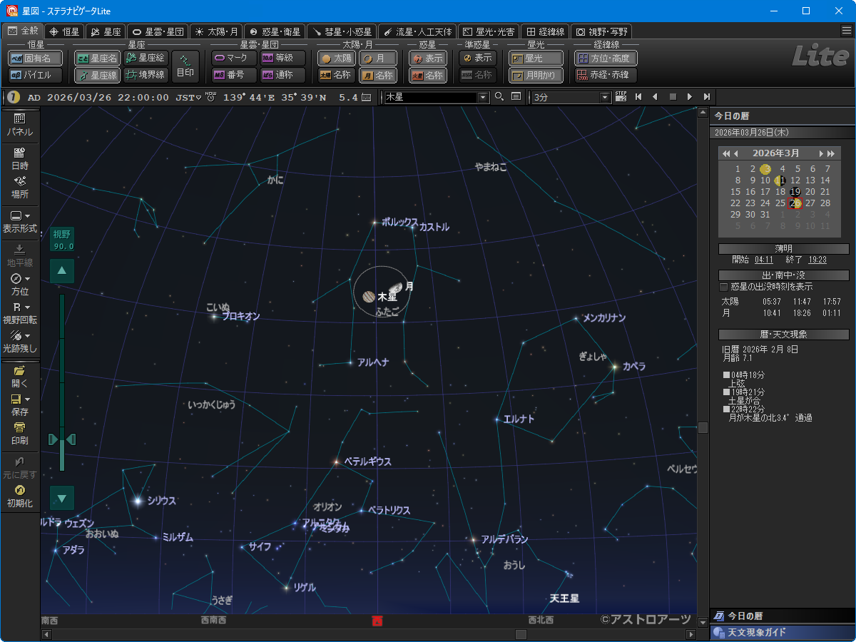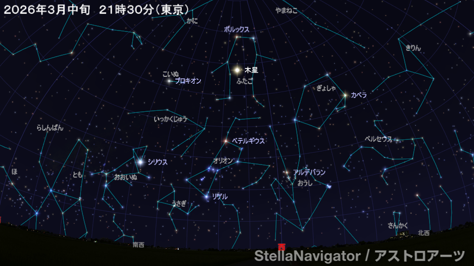 2026年2月中旬 22時の空(東京)。画像クリックで表示拡大(ステラナビゲータで星図作成)。