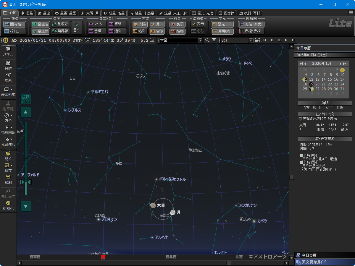| 1月 3日 | 月(月齢14/15)と接近 | 宵~翌4日明け方 |