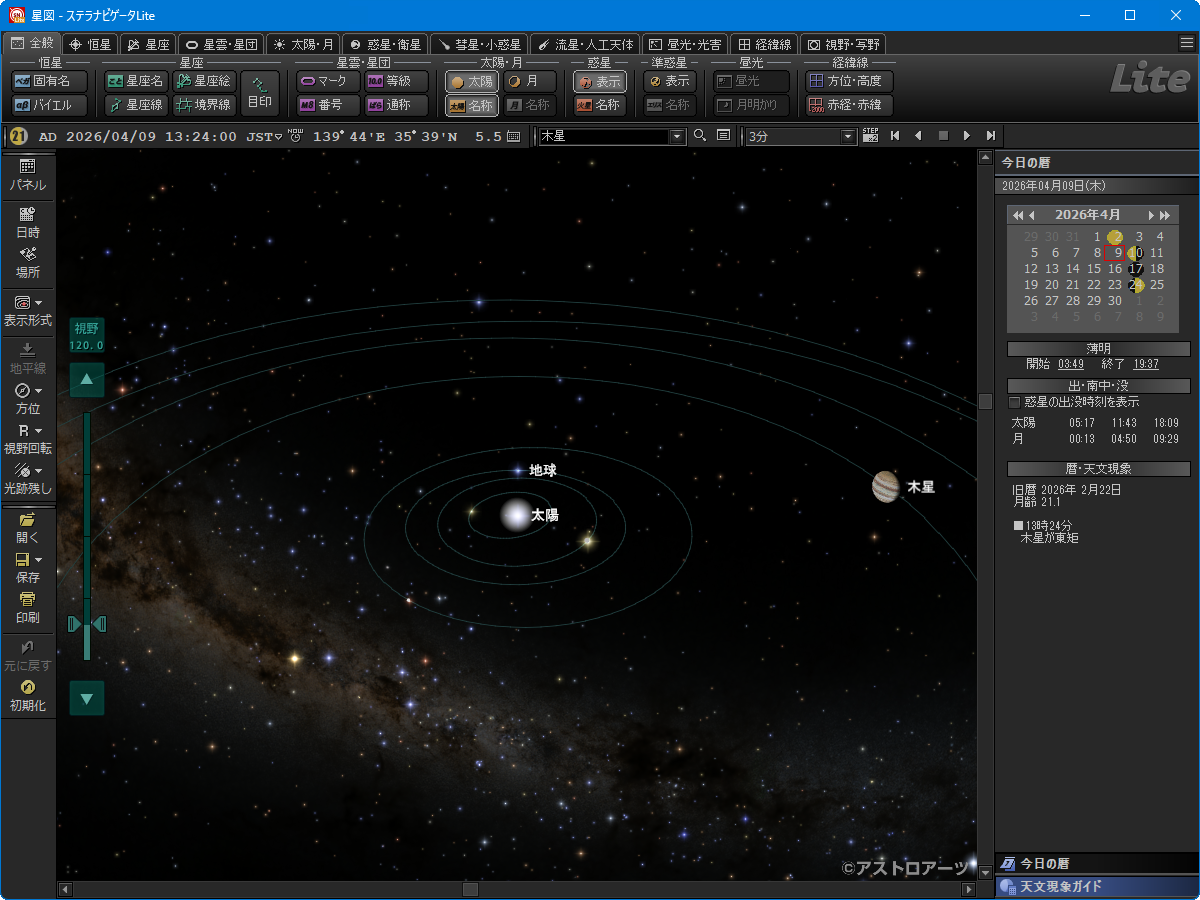 2025年から2026年の木星は12月~5月ごろが観察の好期です。マイナス2.5等級前後ととても明るいのでよく目立ち、街中でも簡単に見つけられます。