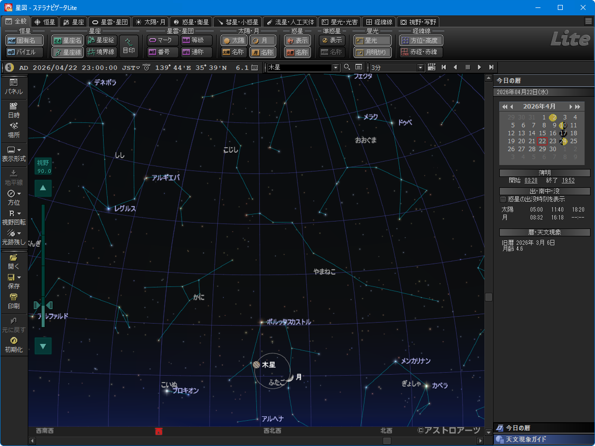 3月26日の夕方~翌27日の未明、月と木星が接近して見える(» 解説)。画像クリックで表示拡大(ステラナビゲータLiteで星図作成)。
