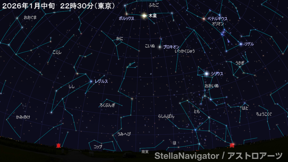 2025年12月中旬 23時の空(東京)。画像クリックで表示拡大(ステラナビゲータで星図作成)。