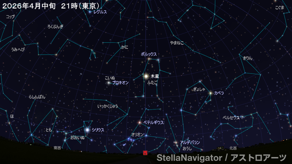 今シーズンの木星は「ふたご座」の領域にあります。11月12日から3月11日までが逆行期間で、この間の1月10日に衝を迎えます。宵空で見やすいのは12~5月ごろでしょう。