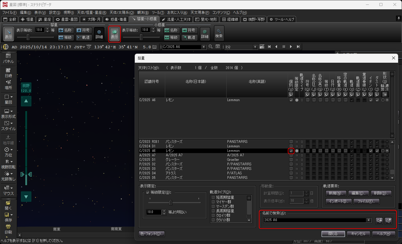 リストにレモン彗星がない場合には、ダイアログ右下の[名前で検索]に彗星名や符号等を入力し、下のリストに表示されたら[個別]にチェックを入れてください。上段にレモン彗星が入ります。 - 必要に応じて[符号][等級]等にもチェックを入れておきましょう。