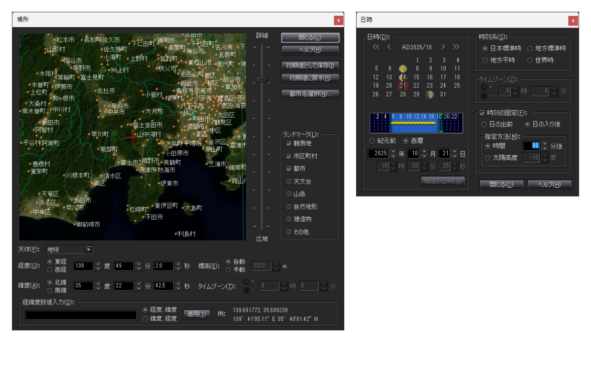 たとえば、[日の入り後][80]分としておけば、薄明中の夕空が表示され、日付を変えるとそれに応じて時刻も各日の日没80分後に設定されます。夕空での高度変化などを調べる際に便利です。 - 「場所」ダイアログでは地図のクリックや数値入力で撮影場所を指定できます。