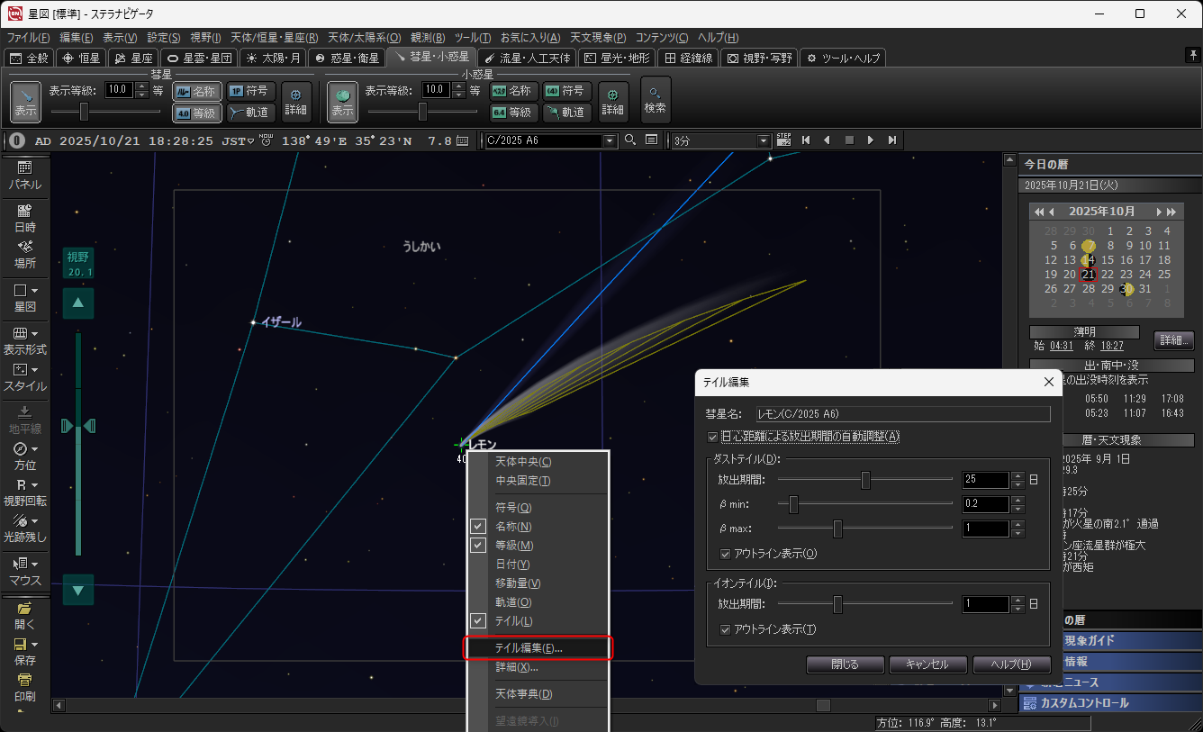 「ツール」メニューの「データ更新」で最新の情報を得られます。 - 彗星の頭部を右クリックして開くメニューから「テイル編集」ダイアログを開くと、尾の見え方や長さを調整できます。撮影画像を参考にしてシミュレーションしてみましょう。