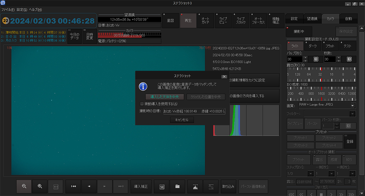 彗星が中央にない場合、[導入補正]ボタンから[導入した天体を中央]を選ぶと写野の中央に再導入されます。