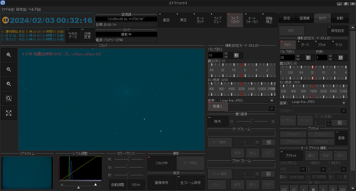 天体の自動導入と撮影が一つのソフトでできる「ステラショット3」を使うと、彗星の撮影が楽になります。薄明中や低空で彗星が確認しにくい場合でも、ソフトに任せておけばO.K.です。撮影中は双眼鏡での観望や広角での彗星星景を楽しみましょう。
