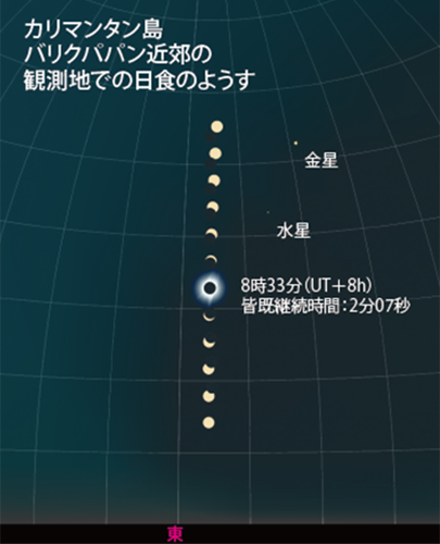 南緯:01°30′08″ 東経:116°27′25″ 標高:14m第1接触: 07時25分12秒 第2接触: 08時32分38秒 最大食: 08時33分41秒/皆既継続時間:2分07秒 皆既時太陽高度:32.3度 第3接触: 08時34分45秒 第4接触: 09時52分33秒 ※経緯度・標高はGPSによる実測、日食の経過は平均月縁による計算による